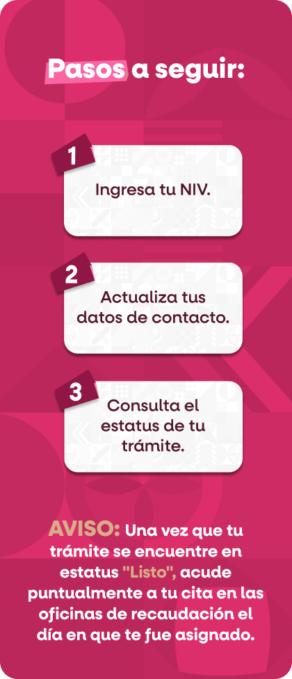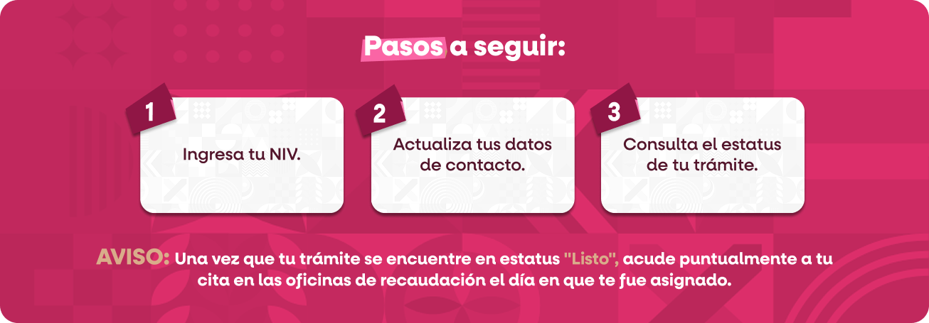 Si tu trámite se encuentra en proceso de revisión deberás actualizar tus datos de contacto, una vez enviada la información deberá esperar a que las Oficinas de Recaudación valide sus datos y posteriormente le sea asignado una cita.